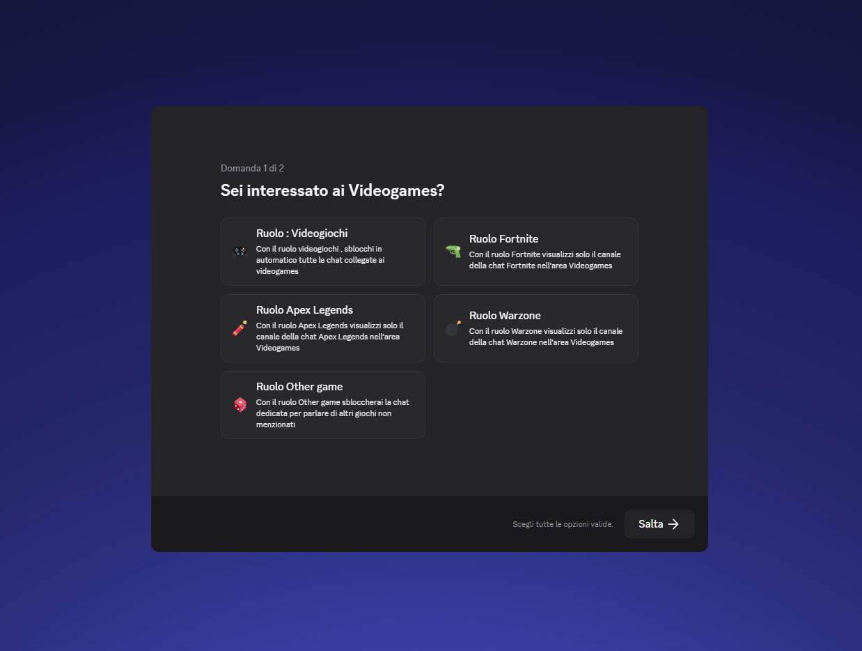 Ora dovrai scegliere il tuo ruolo all'interno del canale. Questo ci aiuterà per classificare meglio quali sono le tue necessità e ti categorizzerà in un determinato gruppo di Player.